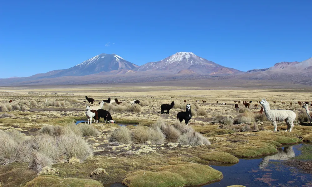 The contrast between volcanoes, mountains, wetlands, and intensely blue skies makes Sajama a natural landscape of extraordinary beauty.